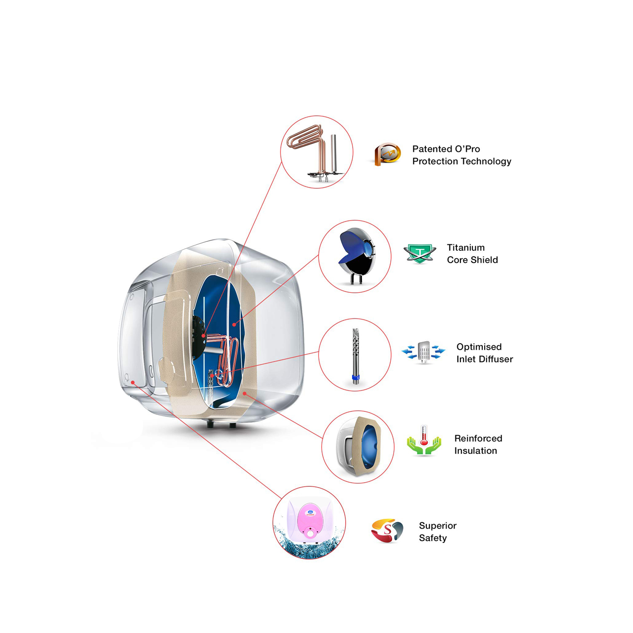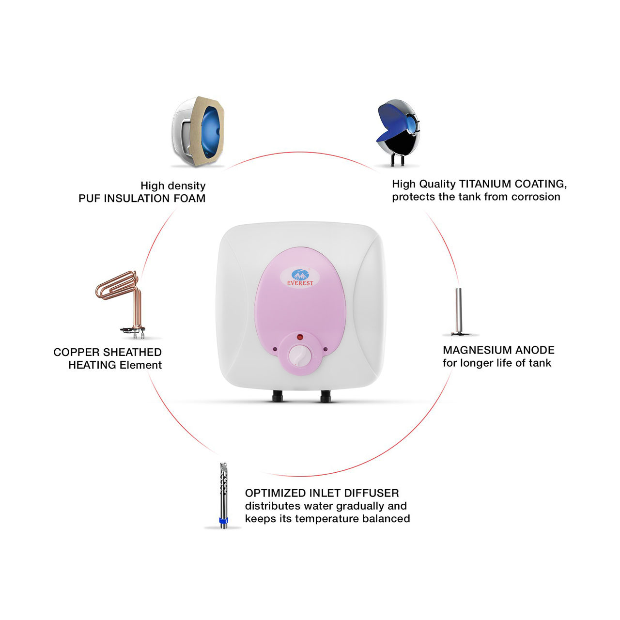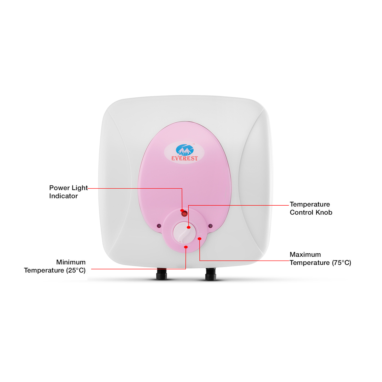 The water heater is available in 6L,10L,15L,25L variants. Available in 5 Star rating. Fire retardant cable. Corrosion proof thermoplastic external body. Efficient heating element for longer life. Neon indicator for 'power on' and 'heating' function. Multiple safety systems. Suitable for high-rise buildings. ISI approved. Everest is a 5 star rated product with 5 star performance and international quality. Convenient temperature settings, longer warranties.