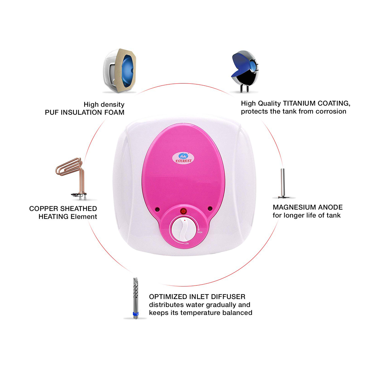 • Heavy duty magnesium anode rod to prevent rust or corrosion and maintain life of element even in hard water