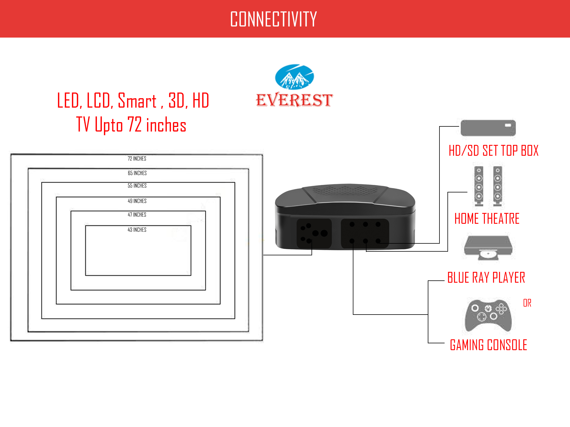 • Application: Smart, 3D, LED, LCD TV up to 72 inch + HD or SD, DTH + Home Theater System , Gaming Console, Blue Ray player