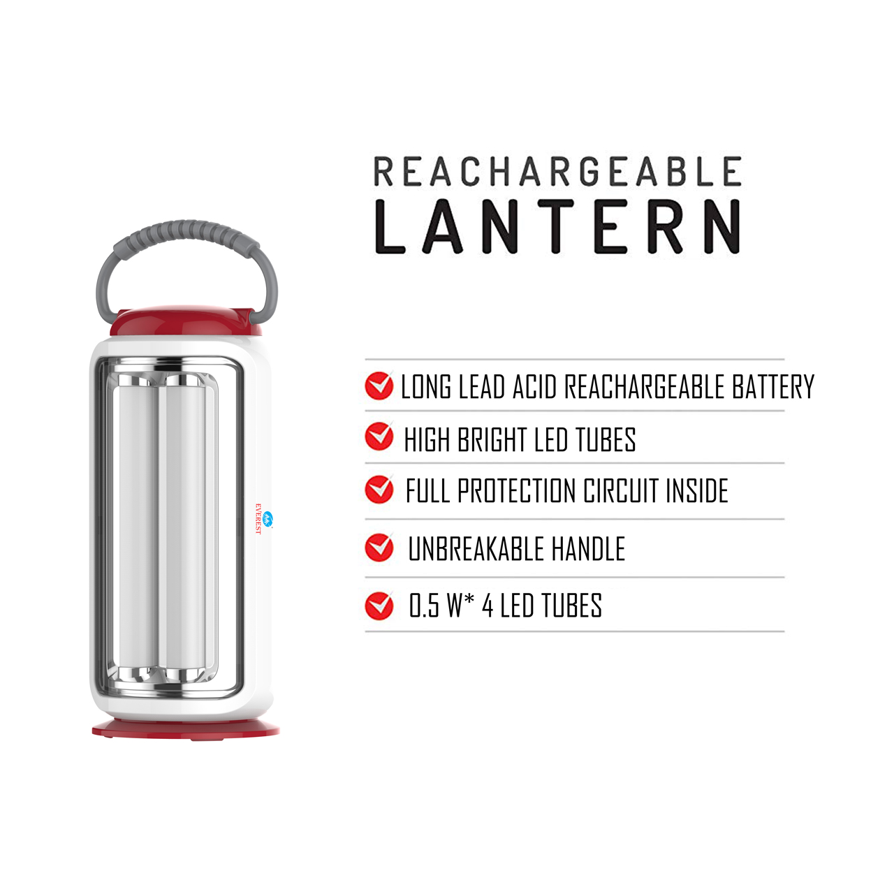 The lantern is made of 4 LED Tubes , which have a life of up-to 50,000 hours. Its operating time of 50/80 hours of strong/dim light respectively, and a full 360° light coverage, makes it the optimum choice for power failures and camping trips. The lithium battery is light weight and easy to replace, with a recharging time of just up-to 20-24 hours, thus saving power as well as enhancing the battery life of the lantern.