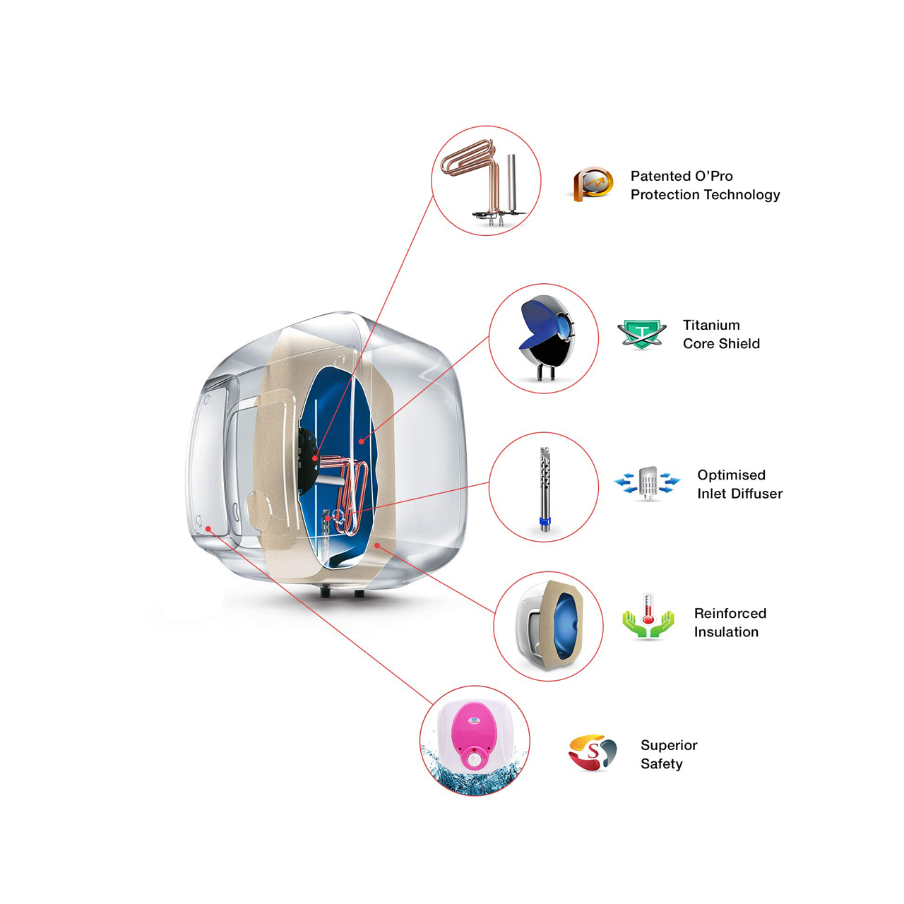 • Dry Heating Protection safeguards the heating element; Advanced Thermostat and Thermal Cut-out Mechanism for Overheat Protection; 5-in-1 Multi-function Safety Valve prevents excessive Pressure Build-up, Vacuum Formation and Reverse Water Flow HYGIENIC and PUNGENT-FREE WATER - Multi-layer protection against Corrosion and Scaling