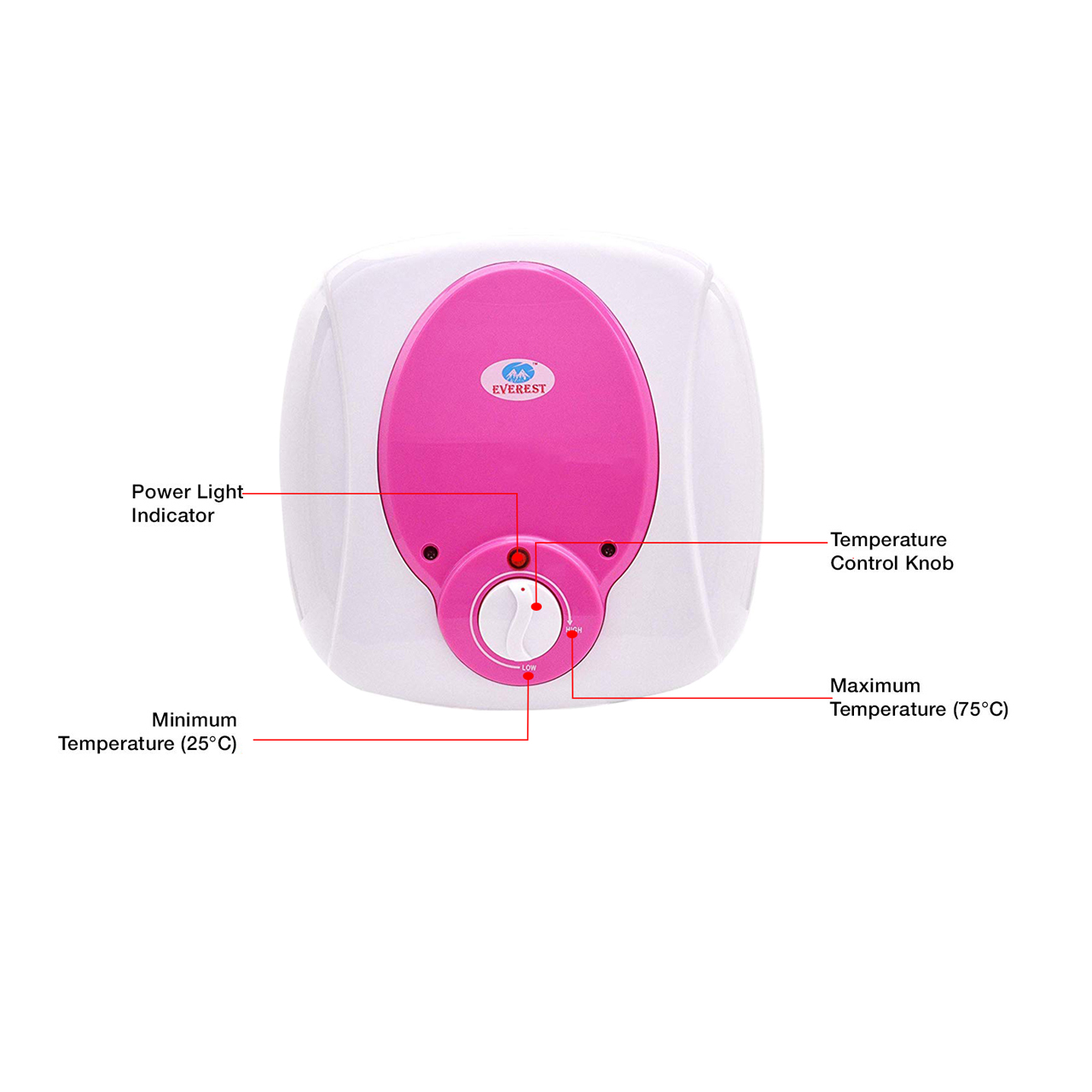 The water heater is available in 6L,10L,15L,25L variants. Available in 5 Star rating. Fire retardant cable. Corrosion proof thermoplastic external body. Efficient heating element for longer life. Neon indicator for 'power on' and 'heating' function. Multiple safety systems. Suitable for high-rise buildings. ISI approved. Everest is a 5 star rated product with 5 star performance and international quality. Convenient temperature settings, longer warranties.