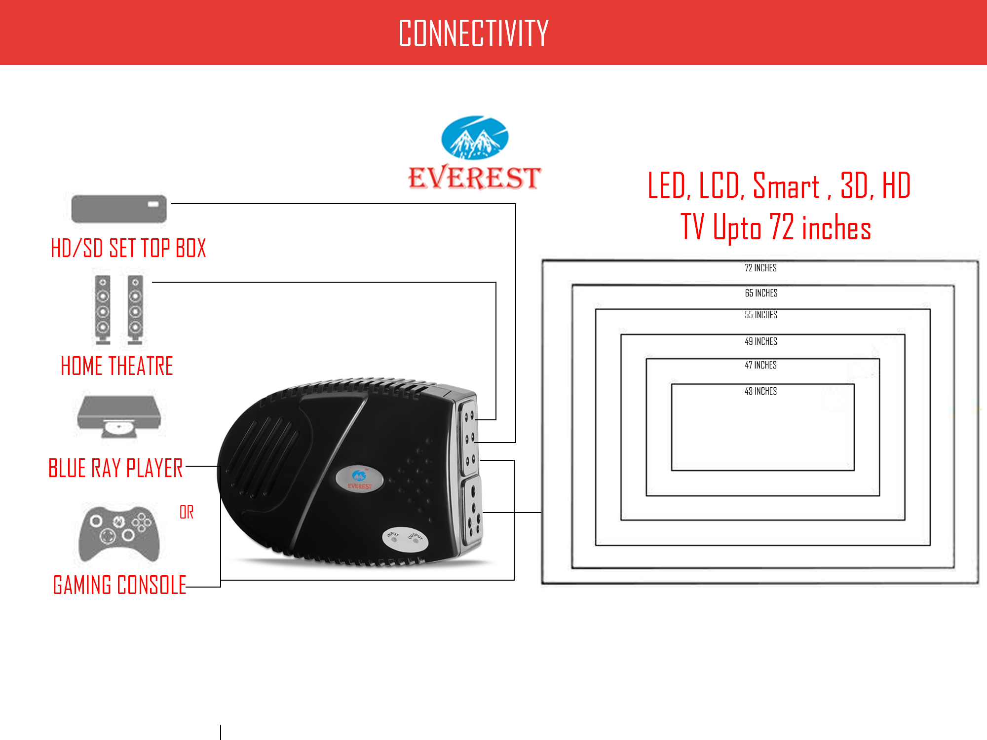• Application: Smart, 3D, LED, LCD TV up to 72 inch + HD or SD, DTH + Home Theater System , Gaming Console, Blue Ray player (Total load upto 1.2 Amps)